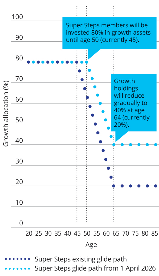 The Super Steps glide path will change from 1 April 2026. Under the new structure, Super Steps members will be invested 80% in growth assets for longer, reducing to 40% in growth assets at age 64. This graphic explains the changes.